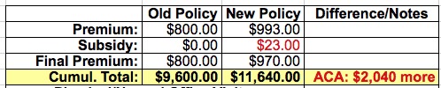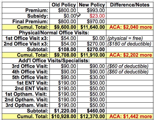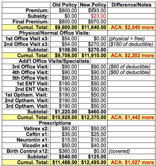 Blammo. With that final addition, the tables have completely turned; the new ACA-compliant policy now saves us almost $4,500 for the year (or $5,500 if you assume that the old plan would have gone up about 10% without the ACA).