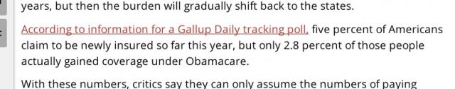 (sigh) No, Ms. Bleau, that's not what the Gallup tracking poll said either. You make it sound like Gallup is claiming that 2.8% of 5% "claim" to be newly insured, which would be only 0.14% of the population. What you meant to say is that 5% are newly insured, of which 56% (2.8 / 5.0) gained coverage via the ACA exchanges.