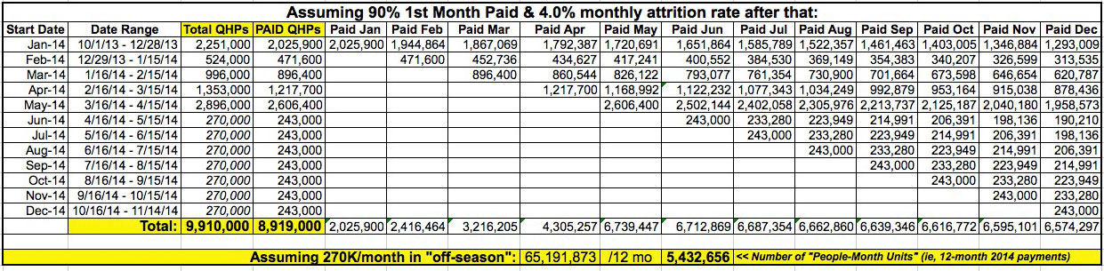 Now, before ACA supporters start thinking that I've Turned To The Dark Side or whatever, take another look at what I said above: Until the 7.3M figure was released on Thursday, I had been operating on the assumption that the average attrition rate of around 3% per month; that's where I got my 7.0M current-as-of-August estimate from. When CMS announced the actual August number as 7.3 million, I dropped the attrition rate down to 2% and voila, it matches up.