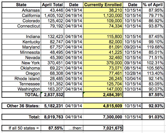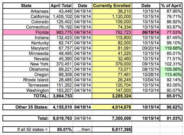 I still stand by this, but an extensive discussion with Jed Graham of Investors Business Daily made me realize that presenting it this way can lead to confusion, because I'm essentially mixing together two different estimated numbers (% paid & attrition rate), each of which may vary widely from state to state, instead of simply comparing the number of people currently enrolled against the 8.02 million who had enrolled (whether paid up yet or not) as of April 19th.
