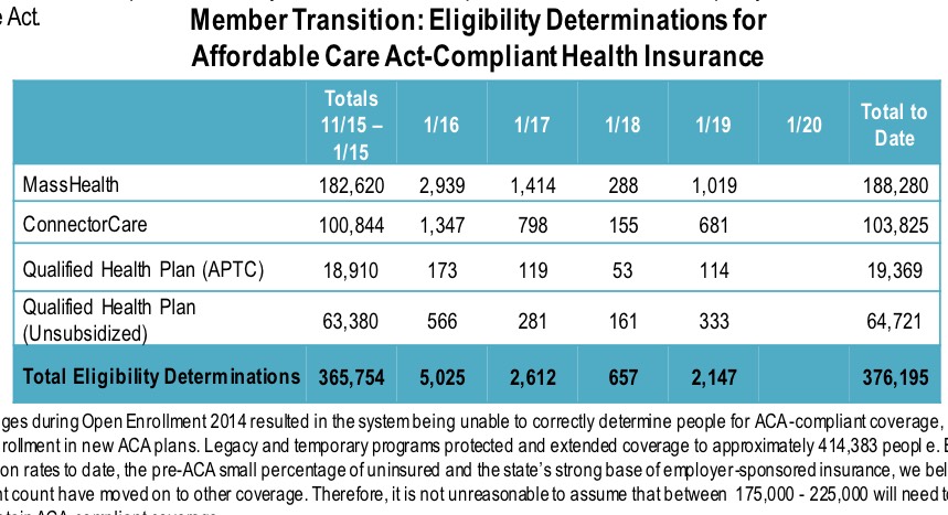 Friday's weekly report gave the latest hard QHP total: 93,262 through 1/14. Over the following 5 days, there were an additional 7,321 QHP determinations made. Using the 45% rule of thumb, that means Massachusett's QHP total should be up another 3,300 or so, for a total of 96.5K through last night.