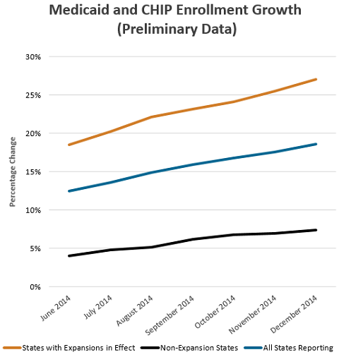 Among states that had implemented the Medicaid expansion and were covering newly eligible adults in December 2014, Medicaid and CHIP enrollment rose by over 27 percent compared to the July-September 2013 baseline period, while states that have not, to date, expanded Medicaid reported an increase of over 7 percent over the same period.