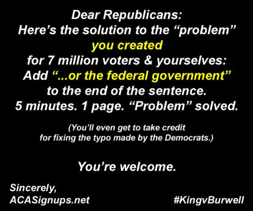 Actions have consequences. Yes, the Democratic Party probably made a minor drafting error when they passed the ACA. However, that error could have been resolved in 5 minutes if the Republicans in Congress hadn't been so obsessed with tearing down anything enacted by Barack Obama (even a law which is pretty much your party's creation). The job of publicly elected officials, in case all of you have forgotten, is supposed to be to make life better for people, which includes not being a royal jackass at the expense of millions of people's well-being.