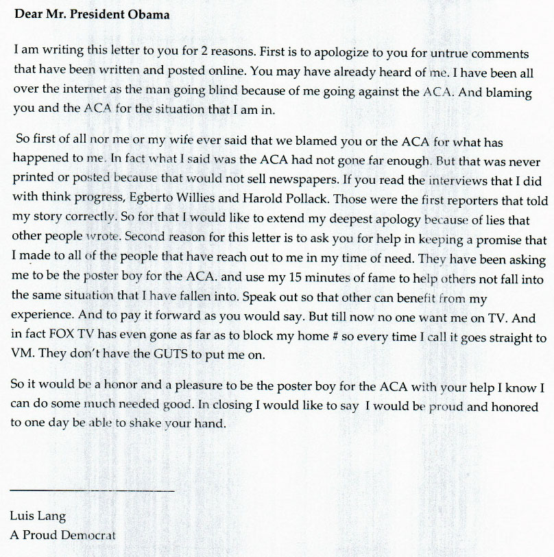 Lang says that he felt a need to apologize to President Obama "for the media" distorting his statements (the letter itself is above; he pretty much reiterated the key points in it, both in terms of the apology and his "keeping a promise" to his GoFundMe donors to become a poster boy for the ACA in a positive fashion).
