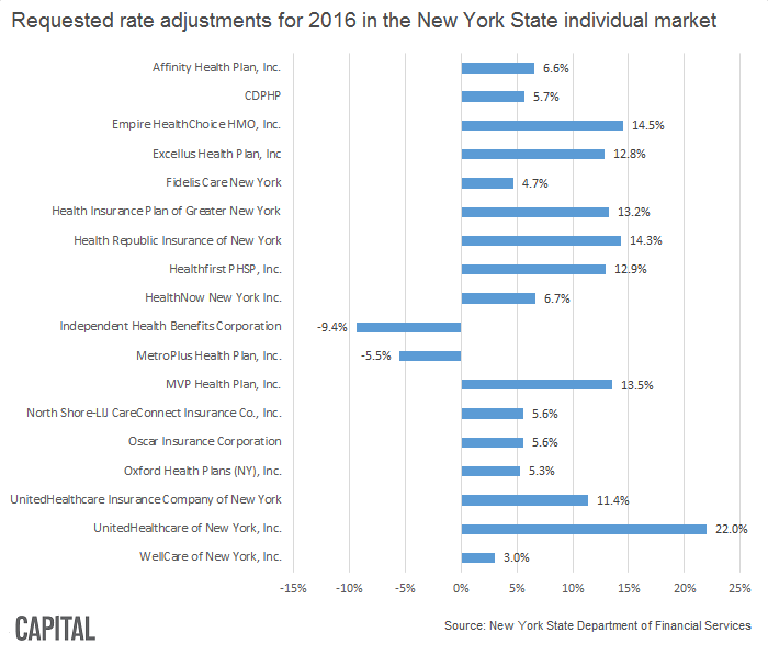 The weighted average increase is 13.5 percent on the individual market and 14.3 percent for the small group market, according to D.F.S., but these are only requests. The rates can—and are likely to be—reduced by D.F.S. before they are approved.