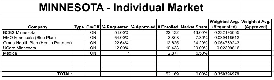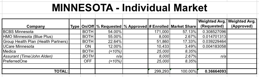 So, there you have it: No matter how you slice it, it looks like individual market insurance carriers in Minnesota are seeking anywhere between a 35-38% weighted average rate hike. Now we'll just have to see whether the regulators lop those numbers down at all before October 10th.