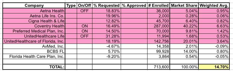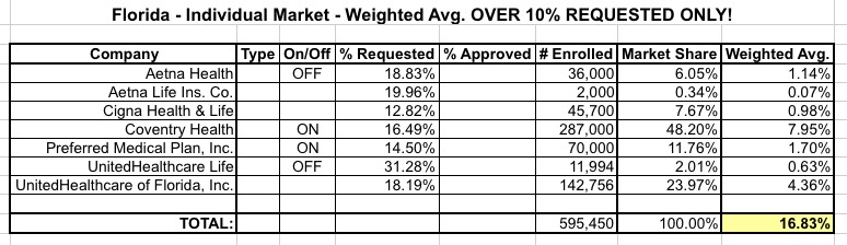 Anyway, assuming I have all my numbers straight here, it looks like Florida, with the 2nd largest individual policy market in the country and the largest ACA exchange enrollment in the country, is probably looking at around a 12.4% weighted average increase (or at the very worst, 16.8%).