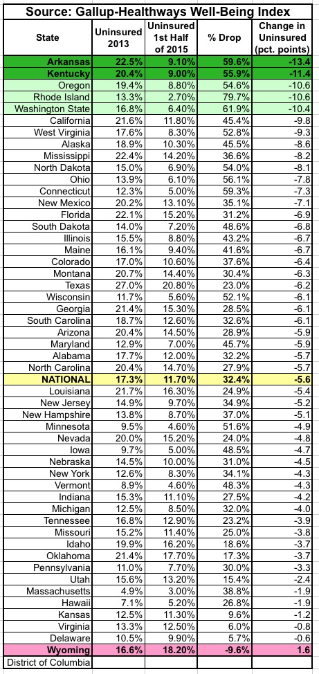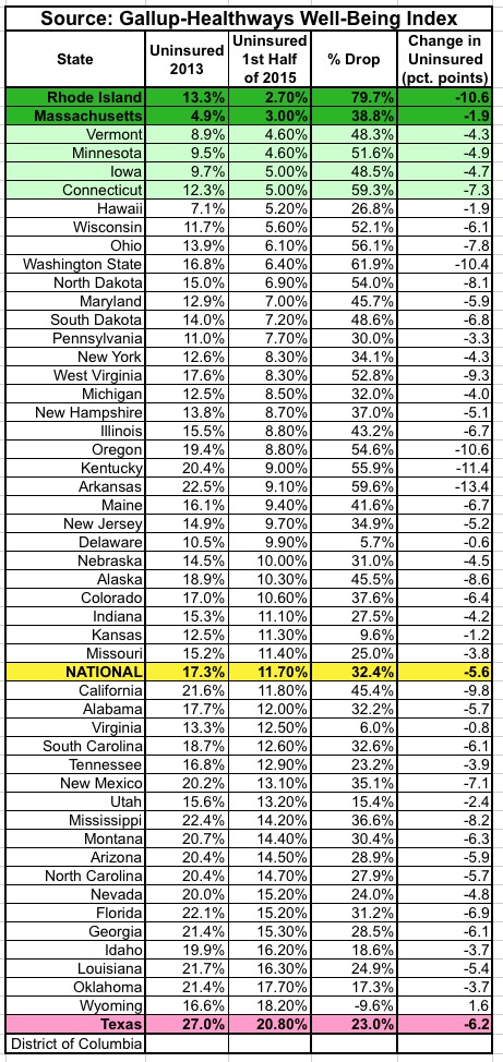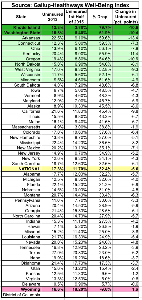 UPDATE: As pointed out by Larry Levitt of the Kaiser Family Foundation, one important caveat: Rhode Island's portion of the survey has a very small sample size for the 2015 numbers, as do several other states (Alaska, Delaware, Hawaii, North Dakota, South Dakota and Wyoming). This means that RI's amazing results might not be quite so impressive after all, while (as noted earlier) Wyoming's "increase" in uninsured residents might not be the case at all. Gallup lists the margin of error as +/- 1-2 percentage points for most states, but +/- 4 percentage points for the 2015 results for these 7 states (the 2013 sample sizes were pretty good for every state, however).