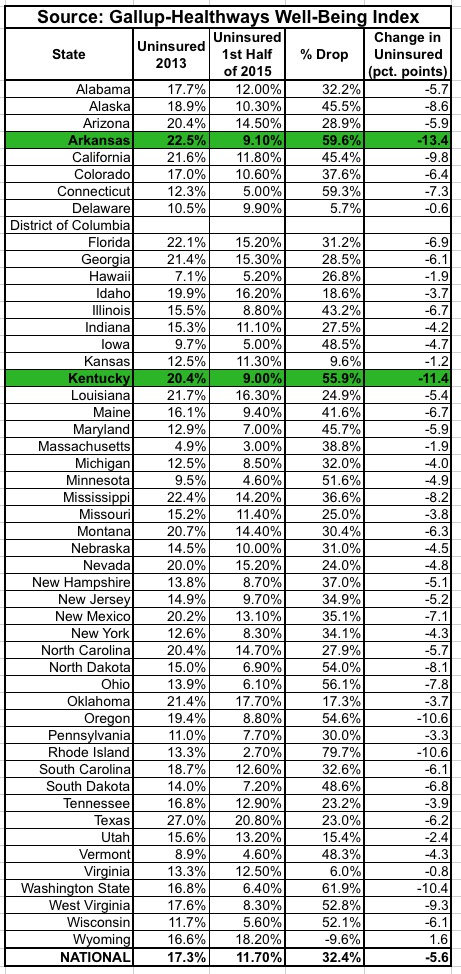 UPDATED: Gallup releases state-by-state uninsured drop; AR & KY getting the headlines, but check out Rhode Island!