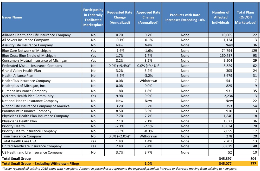 Michigan: *Approved* 2016 weighted avg. rate increase: 6.5% (just 1% for Sm. Group)