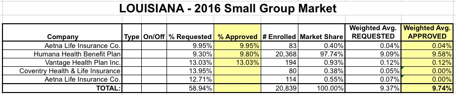 Louisiana's Insurance Dept. website is refreshingly complete: It includes every company on the individual & small group market, lists both the requested and approved rate hikes, and includes direct links to the filings which list the actual total enrollment in a clear-cut, consistent fashion.
