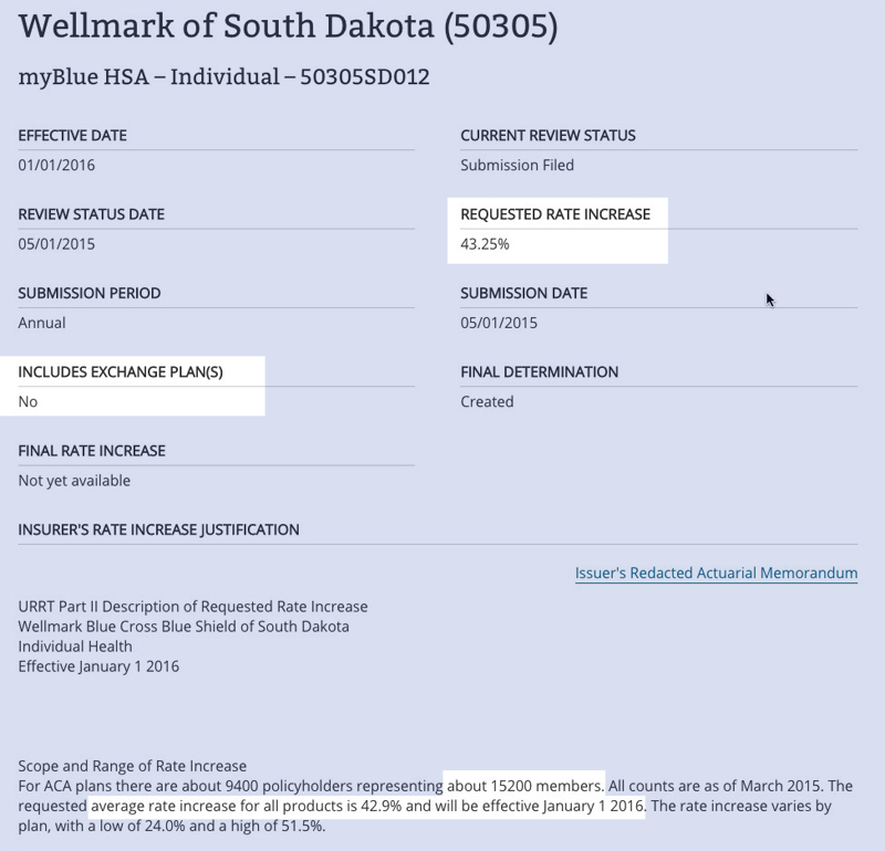 The others, including some nominally enrolled plans as well as Wellmark of South Dakota's 15,200 enrollees, are only sold off-exchange...and given that Wellmark is requesting a whopping 42.9% hike, that seriously jacks up the state-wide average: