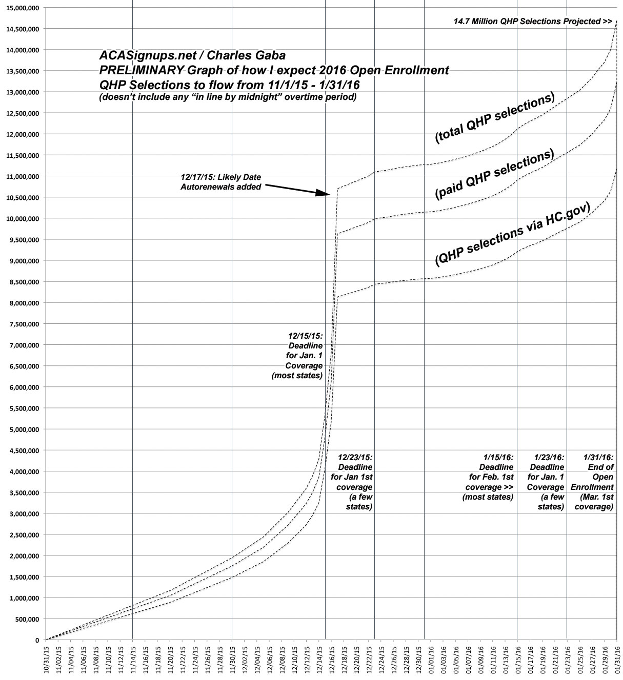 The dramatic vertical spike in mid-December was partly due to the enrollment spike for the 12/15 deadline (in most states) for January coverage, but is mostly due to the bulk auto-renewals of about 3 million people al at once (2.5 million via HealthCare.Gov, plus another half-million or so via various state-based exchanges (SBMs)). After that, there was a very slight jump a week later (several SBMs made 12/23 their January deadline), followed by another "mini-spike" around 1/15 (the deadline for February coverage), and of course a third, more dramatic spike around 2/15, since that was the official deadline for March coverage and the close of Open Enrollment. After that, of course, there was a one-week "Waiting in Line by Midnight" overtime period tacked on for people who had started the enrollment process by 2/15 but hadn't completed it yet for whatever reason. The "true" deadline ended up being 2/22/15 for just about everyone.