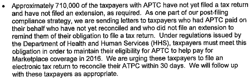 The wording of the article seems to be pretty clear that the two groups don't overlap; that's 710K who didn't file at all, plus another 760K who filed but forgot the form. That's up to 1.47 million people who a) were enrolled in ACA exchange policies as of last spring and b) were receiving tax credits. According to the CMS division, there were 8,656,210 people receiving APTC as of March 30th...so, assuming I'm reading this correctly, the IRS is saying that a whopping 17% of them are at risk of losing their subsidies if they try to renew their policies for 2016. OUCH.