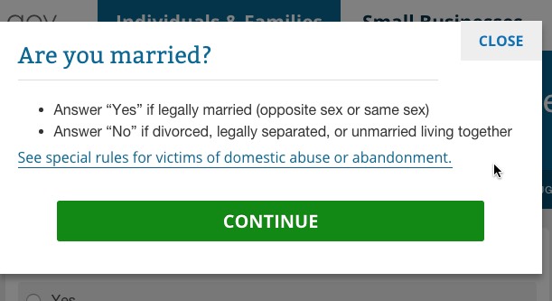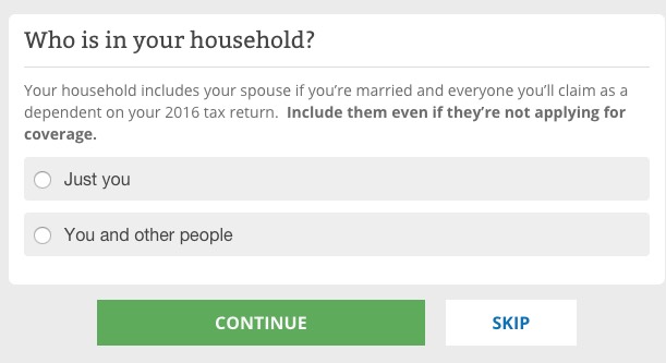 In addition, in poking through the HC.gov Window Shopping tool today, I noticed a couple of additional minor but interesting updates. First, ont he "Who is in your household" screen, they've added a little note at the top; apparently some people didn't realize that tehy have to include all dependents even if they're covered elsewhere already: