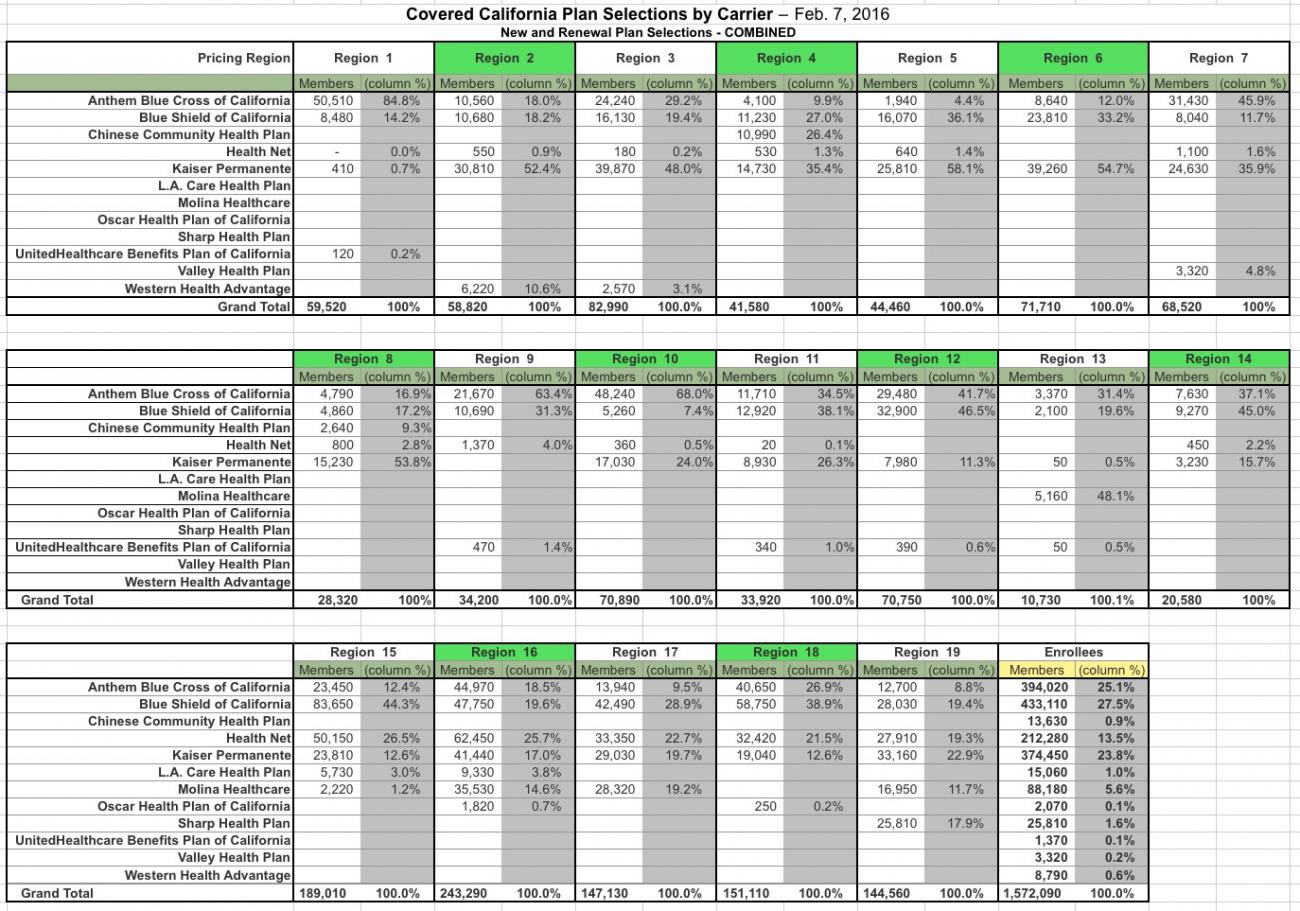 Covered California held a press call a few minutes ago in which they released detailed enrollment numbers for the 2016 Open Enrollment Period, broken down a number of different ways, including by rate region and individual carrier market share. They even broke the individual numbers out between renewals and new enrollees.
