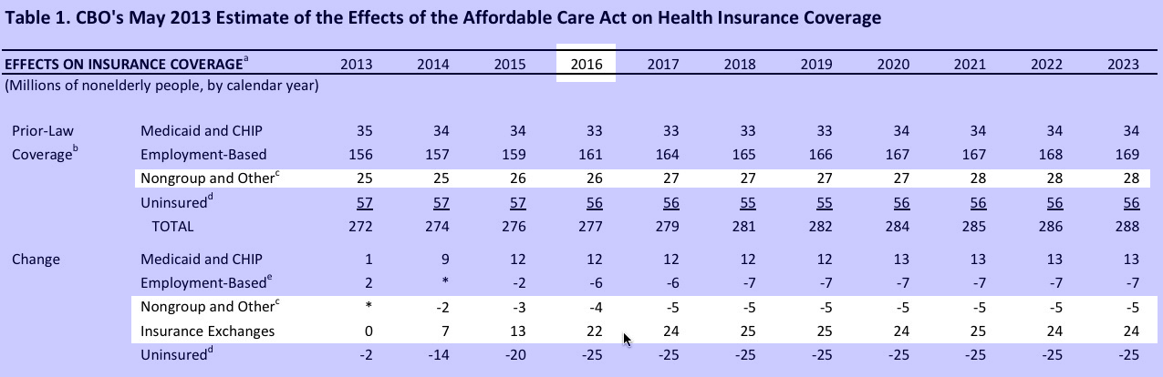 As you can see, in 2013 the CBO assumed that the total individual market would have increased to 26 44 million by now (22 million on exchange, around 9 million off exchange, 3 million via the Indian Health Service, 9 million non-senior Medicare and 1 million or so student health plans)...but this was partly based on the assumption that 6 million people would move off of their employer-sponsored plans over to the indy market. They figured that about 22 million people would be enrolled through the exchanges.