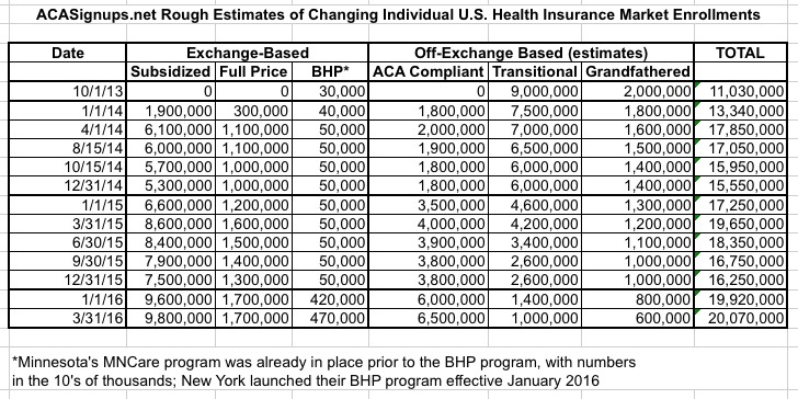 For the exchange-based columns, I used hard numbers based on the number of paid QHP enrollments as of the listed dates, which are generally about 10-12% lower than the total number of policies selected. These numbers drift downwards somewhat as the year progresses due to attrition as people drop off their policies, as well as getting kicked off for non-payment or legal residency verification issues, before shooting back up again in the early part of the following year. The same thing happens to a lesser extent for the ACA-compliant off-exchange policies.