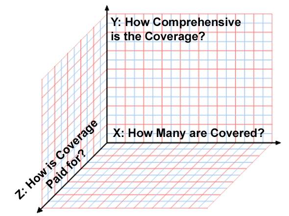 Think of these as X/Y/Z axes (OK, 4 axes, really). "Universal" refers to how many people in the population are covered by a given program. "Comprehensive" refers to what types of services are covered by it. "Single Payer" relates to how the coverage is paid for. "Socialized Medicine" refers to who the healthcare providers work for. There's also a couple of other axes such as "Portability", which is what I'm using as a label for how large the network is of providers who accept the coverage. Here's a little graphic of the first three axes: