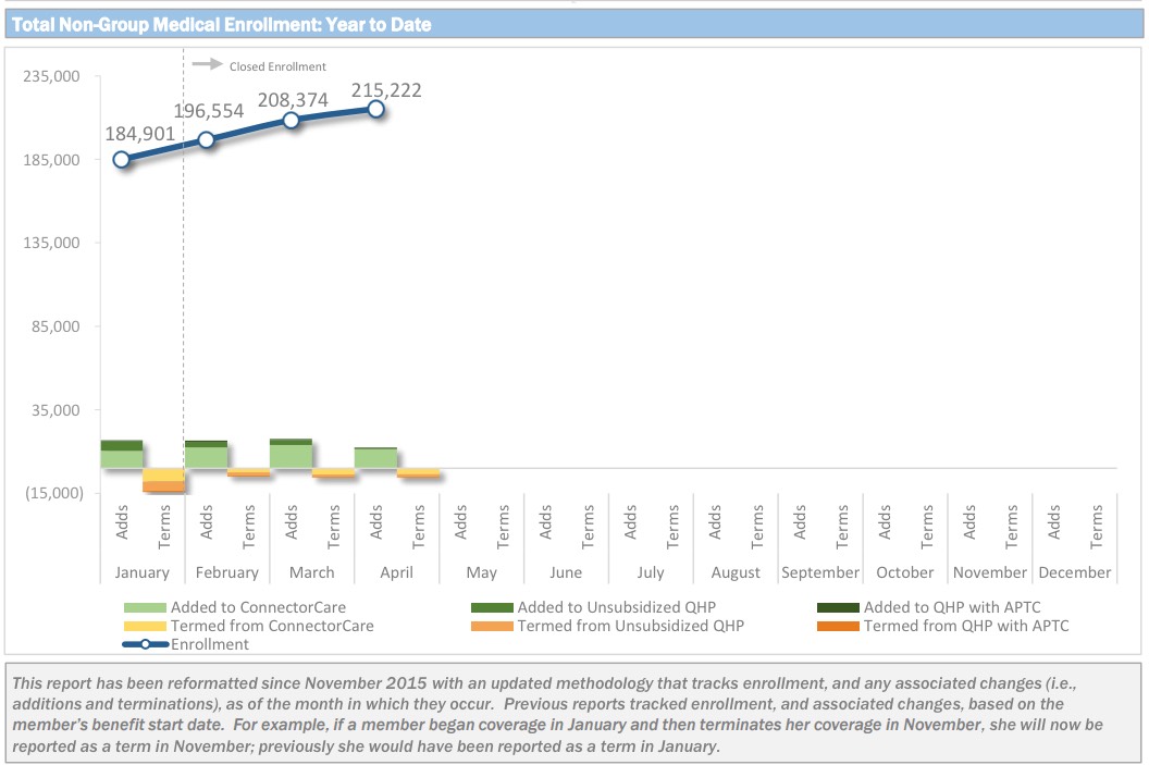 I noted last month that the Massachusetts Health Connector had increased their effectuated QHP enrollee total by around 12,000 people in the first month of the off season, which goes against the expected net attition expected once Open Enrollment ends.