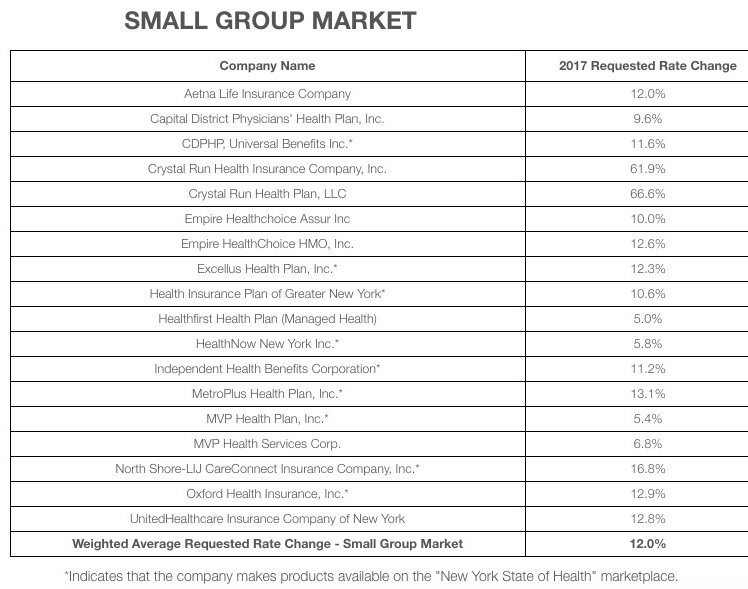 And there you have it: A weighted average requested rate increase of 17.3% across the entire state's ACA-compliant individual market. Remember that NY never allowed transitional plans anyway, and there are likely only a handful of grandfathered plans left on the individual market, so this should cover well over 90% of the market.