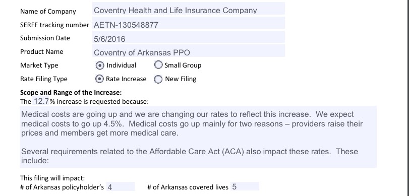 Arkansas was a little weird...while the rate filings for 5 carriers are listed over at RateReview.HealthCare.Gov, the carrier with the largest individual market share in the state, BCBS (aka "USAble Mutual") is nowhere to be seen (there's a sm. group listing for them, but not individual). However, when I went directly to the AR SERFF database, there they were--and it's listed specifically as "2017 Individual QHP Rates", so there's no question here about whether they plan on offering ACA-compliant policies in 2017.