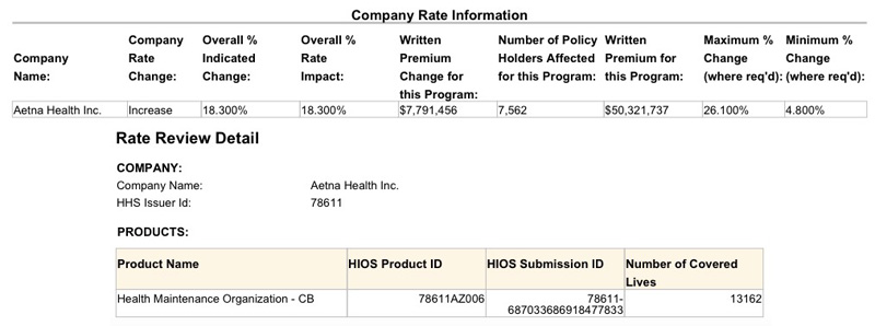 As you can see, Aetna's membership is pretty cut and dry: 13,162. However, while the "requested rate increase" is listed as 11.67% at the top, in the details it lists it as 18.3%. I checked the HFAI database as well, and that uses the 18.3% figure, so that's what I'm going with. Where did 11.67% come from? Beats the hell out of me.