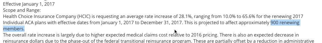 Yup, the rate impact is correct (64.87%) and the number of policyholders matches (81,261)...but look at the number of covered lives. This should obviously be at least as high as the policyholders, but should actually be somewhat higher, since each policyholder represents a household. Generally the covered lives should be around twice as high as the policyholder number...yet here they only add up to 52,933 people.