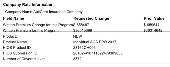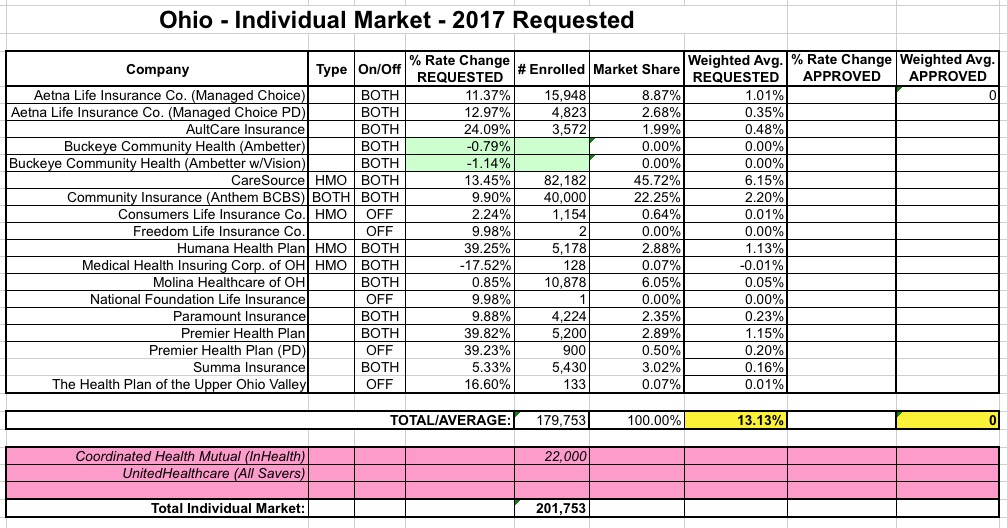 Here's some relatively good news! Ohio's 2017 requested rate filings have finally been published, and considering that some other states are looking at weighted average requested increases of 30%, 40% or even as high as 56%, Ohio's 13.1% average is actually refreshingly low by 2017 standards.