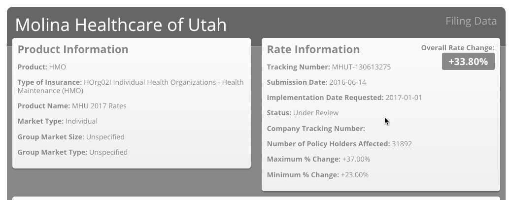 UPDATE 6/22/16: I've been informed that there was a coding glitch with Utah's website which prevented several carrier rate filings from being listed. I've gone back and plugged in the additional carriers, which account for about 32,000 more Utah residents...but which only moves the weighted average slightly, since Molina's request is fairly close to the 30% average I already had estimated.