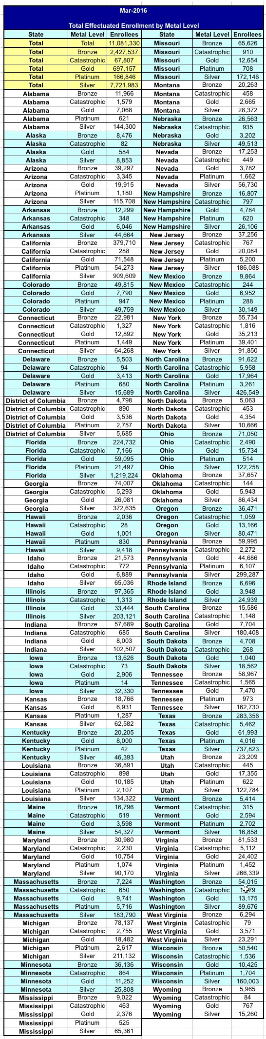 - Table 3: March 31, 2016 Total Effectuated Enrollment Data by Metal Level by State