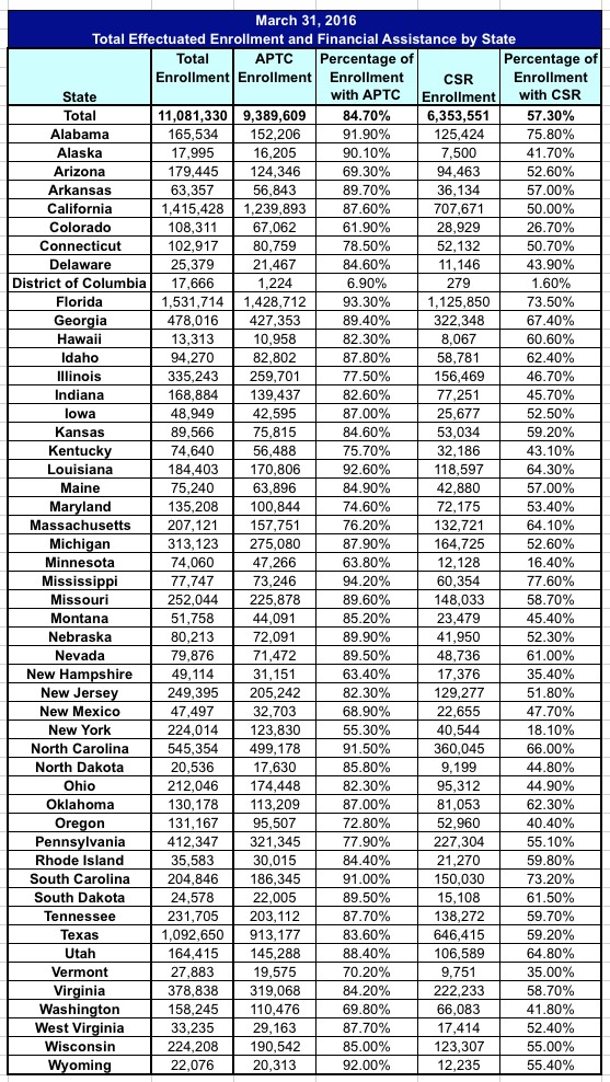 - Table 1: March 31, 2016 Total Effectuated Enrollment and Financial Assistance by State