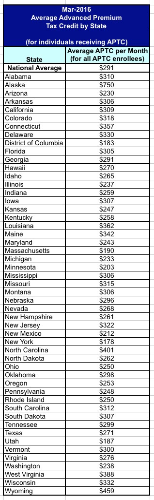 The overall average APTC Marketplace consumers received was $291 per month at the end of March 2016. Because the amount of APTC an enrollee may receive depends on household income and the cost of the second lowest cost Silver plan available to the enrollee, the average APTC ranged from $750 per month in Alaska to $178 per month in New York.