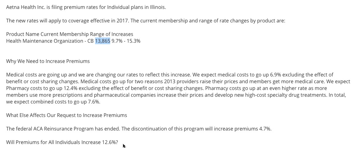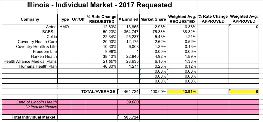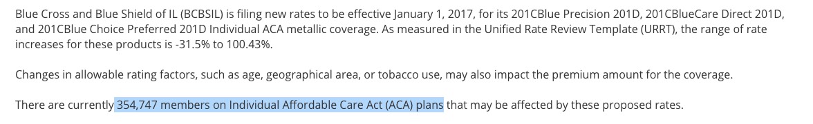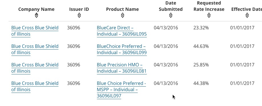 UPDATE: Ouch. As a couple of people called to my attention, while the individual listings for BCBSIL range from 23% to 45%, their actual average requested rate hike is higher yet: 50.2%. As ACA opponent Jonathan Ingram explained, the lower rates appear to include policies which are being cancelled, while the 50.2% figure includes those who are expected to be mapped to plans which will still be available. I've updated the table above to reflect this correction.