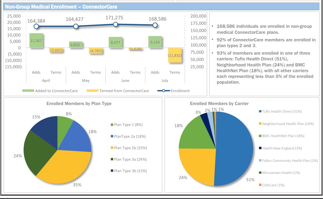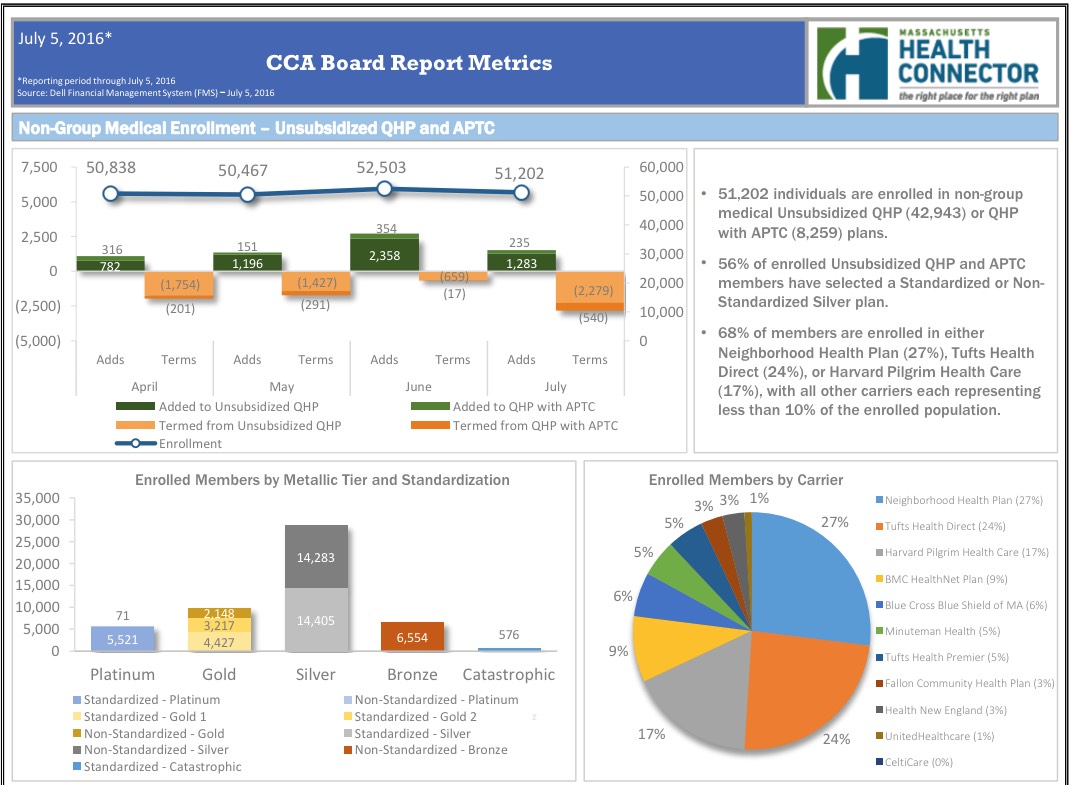Of those, over 207,000 were still actively enrolled as of the end of March. MA didn't allow transitional plans, and the bulk of their pre-ACA individual policies were already pretty comprehensive thanks to the ACA's predecessor, "RomneyCare", so I'm pretty sure they have very few non-ACA compliant "grandfathered" enrollees either. The point of all this is that the Massachusetts Health Connector enrollment numbers should cover the vast majority of ACA-compliant enrollees state-wide.