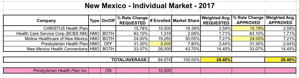 Three of the 5 carriers had their final requests approved exactly as is by state regulators. CHRISTUS and Molina have yet to be approved, but based on a lengthy online conversation with someone very much in the know about the New Mexico health insurance market, I'm highly inclined to believe that both of their final asks will be approved as is as well.