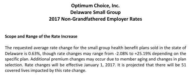 Delaware: Approved *unsubsidized* 2017 rate hikes: 30.2% (indy mkt), 6.9% (sm. group mkt)