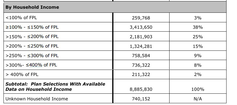 Now, an important qualify is needed here: That's 2% of those who reported their income. There's another 740,000 people who enrolled via HC.gov who didn't report their income at all, so you have to add them into the mix (remember, this is for HealthCare.Gov only, so it doesn't include the state-based exchanges):