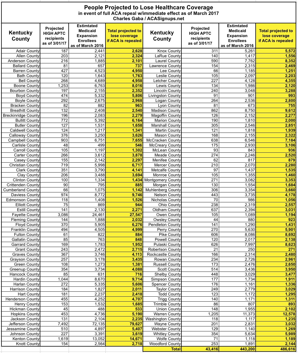 In Kentucky, assuming 80,000 people enroll in private exchange policies by the end of January, I estimate around 43,000 of them would be forced off of their private policy upon an immediate-effect full ACA repeal, plus another 443,000 enrolled in the ACA Medicaid expansion program, for a total of 487,000 residents kicked to the curb.