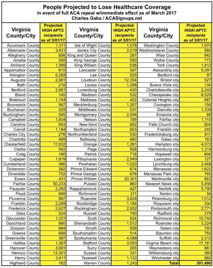 In the case of Virginia, assuming 450,000 people enroll in exchange policies by the end of January, I estimate around 301,000 of them would be forced off of their policy upon an immediate-effect full ACA repeal.