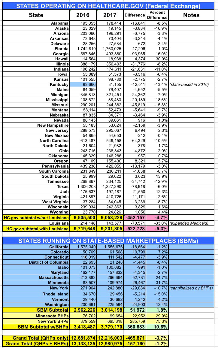 UPDATE: Oh, since I spent so much time noting the impact of Trump's "Final Week Ad-Kill" on the final HealthCare.Gov enrollment numbers, I should also update this table, which compares the HC.gov states to the state-based exchange states. It's not quite as dramatic a difference, but there's still a huge disconnect between the two. Again, HC.gov states saw a net drop of either 4.7% or 5.3% (depending on whether you include Louisiana or not, since they expanded Medicaid mid-year)...while enrollment across the 12 state-based exchanges increased by 1.8% year over year. Furthermore, if you include the BHP programs in Minnesota and New York, the SBMs actually saw a whopping 10.6% increase in enrollment year over year!