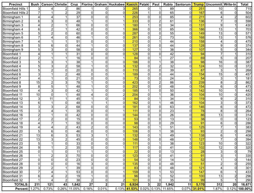 And yes, Kasich still won if you limit to the actual city of Bloomfield Hills itself, although closer (40% to 34%), although that's out of just 1,219 votes total.