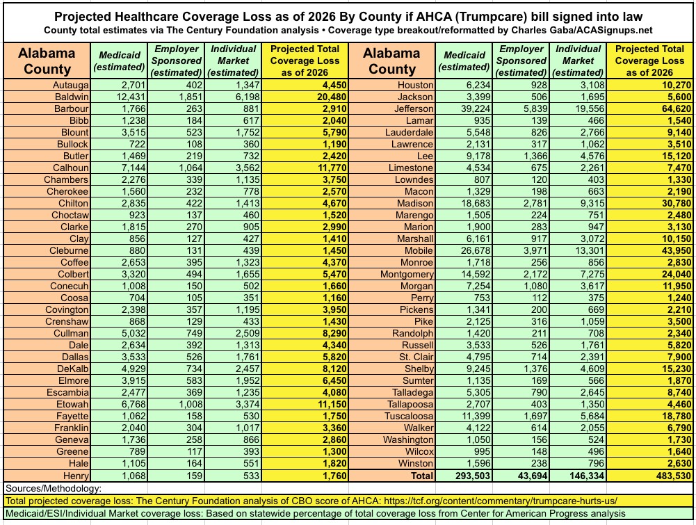 With that in mind, here's the County Level breakout of the Century Foundation's projections of how many people would lose healthcare coverage by 2026 under the GOP's AHCA bill. The yellow columns (Total) come directly from TCF's analysis; the green columns (type of coverage loss) are my own proportional estimates within those totals.