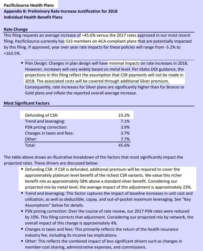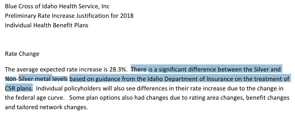 The proposed increases for Silver level plans on the exchange are significantly higher this year, even more than the increases for Bronze or Gold level plans, due to the potential refusal by the federal government to fund the Cost Share Reduction (CSR) mechanism. The CSR requires insurance carriers selling plans through Your Health Idaho to lower deductibles and out-of-pocket maximums on Silver plans for enrollees who earn below 250% of the federal poverty level. “I call on Congress to either repeal the CSR requirement or fund the program,” said Director Dean Cameron. “That action alone would reduce the proposed increase by at least 20% on the Silver plans.” The premium requests for the Silver level plans reflect the cost of the CSR benefits since the carrier is still obligated to provide the benefits regardless of whether or not the program is funded at the federal level.