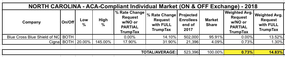 Cigna's 31.9% request hasn't changed. Assuming a similar 14 point CSR factor (Kaiser Family Foundation pegged NC at 20 points, but that only applies to Silver plans), here's what the NC weighted unsubsidized average increase requests should now look like: