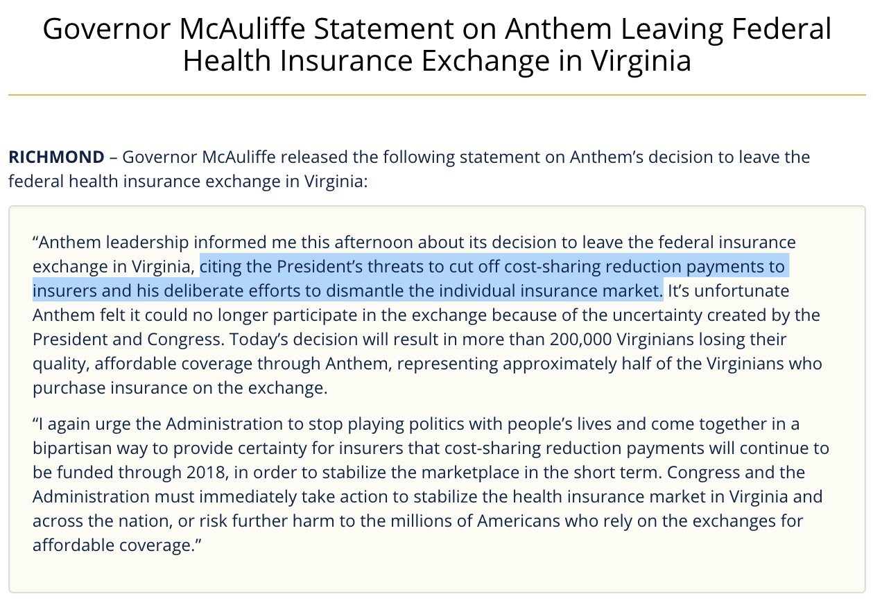 UPDATE: Just in case anyone was still unclear as to the reason for Anthem pulling out of Virginia's individual market: