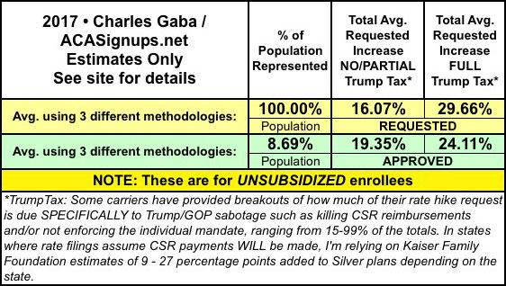 • In August, I had the non-sabotage factors broken into just 2 parts: Medical inflation and the reinstatement of the ACA carrier tax. After reading over more filings and thinking it through, I've decided that it's a bit more complicated than that; many carriers have stated that their "morbidity" in 2017 is still a bit worse than they thought, which basically means that a couple of rate hike points are still simply making up for underpricing in previous years.