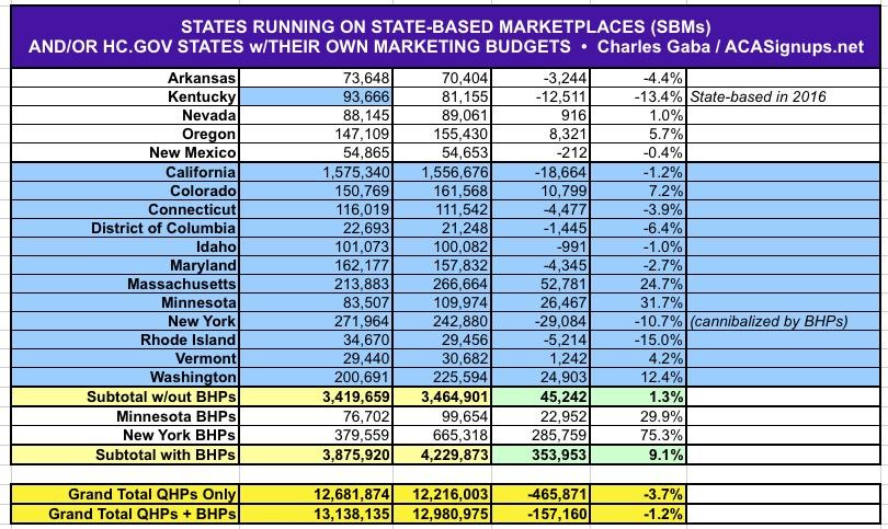 Interestingly, at the same time, the "ran their own marketing budget" states (SBMs plus the 5 "piggyback on HC.gov" states) also looks a bit worse: Instead of a 1.8% increase (10.6% with BHPs included), they now only saw a 1.3% bump (9.1% with BHPs). Even with these shifts, the overall year over year drop is still identical, of course (3.7% nationally, or 1.2% with BHPs added).