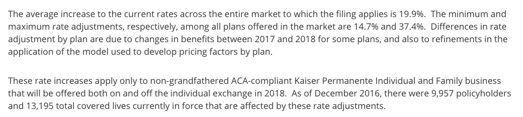 Hawaii only has two carriers on the individual market (and in fact doesn't even have much of an individual market due to a state law mandating that nearly every business provide coverage anyway). HMSA's filing letter is very specific about calling out both the CSR and mandate enforcement sabotage factors as being part of their request. Kaiser doesn't really mention either issue at all, and the only CSR reference in the filing seemed to assume it would be paid, so I have one in each category. Kaiser Family Foundation assumes a 21% Silver CSR rate hike, and 71% of Hawaii's exchange enrollees are on Silver plans, so that amounts to roughly a 15% overall CSR factor.
