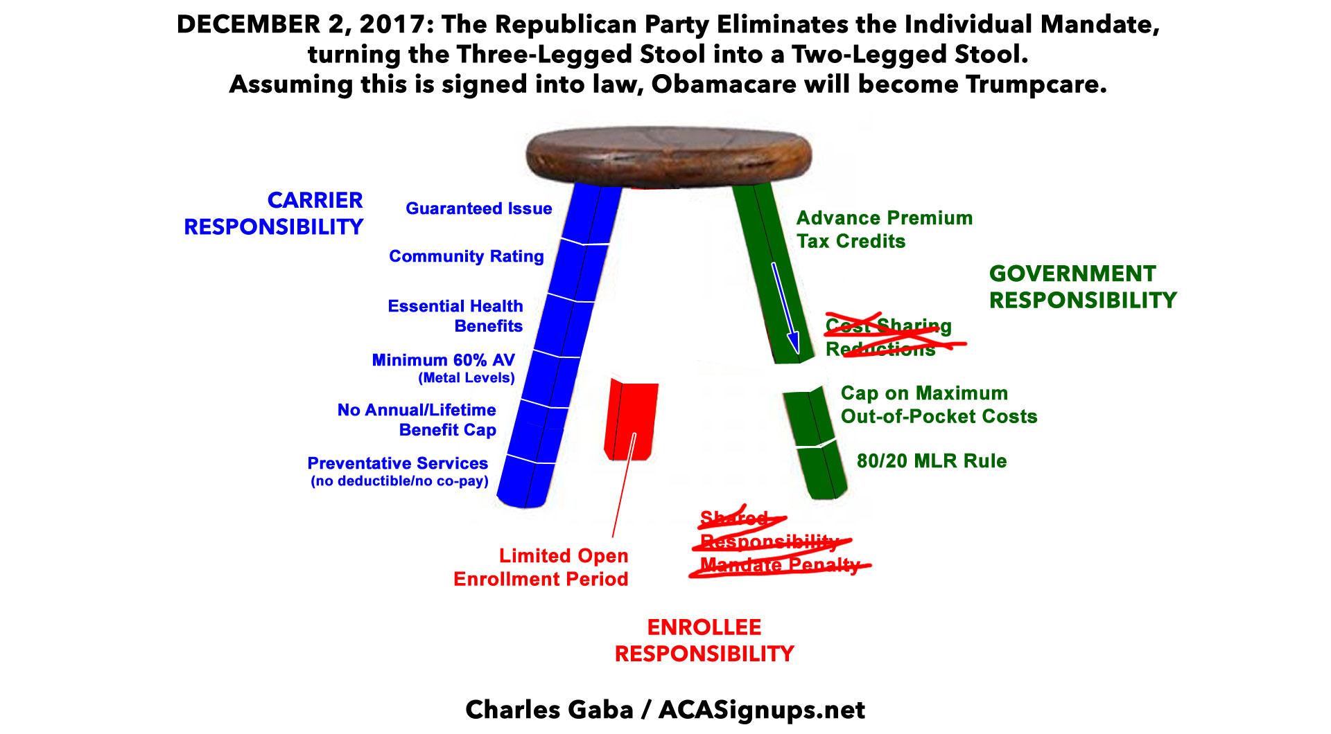 It's not over yet, since the House of Representatives still has to vote on the bill again (either as is, or after hashing out the differences between the House and Senate versions of the bill), but assuming the final version of the bill includes mandate repeal and is indeed signed into law, this is what the ACA's 3-legged stool would look like when the dust settles.